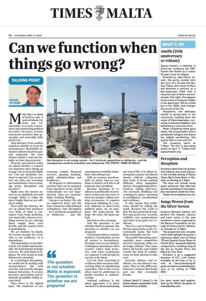 In his recent Talking Point for the Times of Malta, retired Colonel David ‘dp’ Attard issues a clear wake‑up call about national fragility — from energy and supply‑chain dependence to cyber and institutional vulnerabilities — asking bluntly, “The question is not whether Malta is exposed. The question is whether we are prepared.”