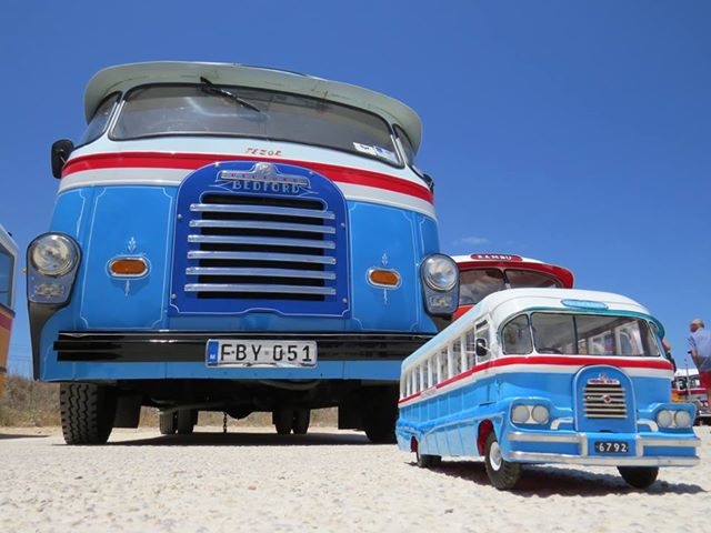 Little and large: The real thing and a model of a vintage Kalafrana bus sit side by side for the camera.