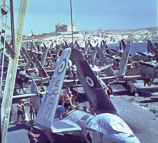 Busy on deck: Aircraft from Hal Far are loaded onto HMAS Vengeance off Marsaxlokk Bay in 1955 with St Lucian Tower in the background