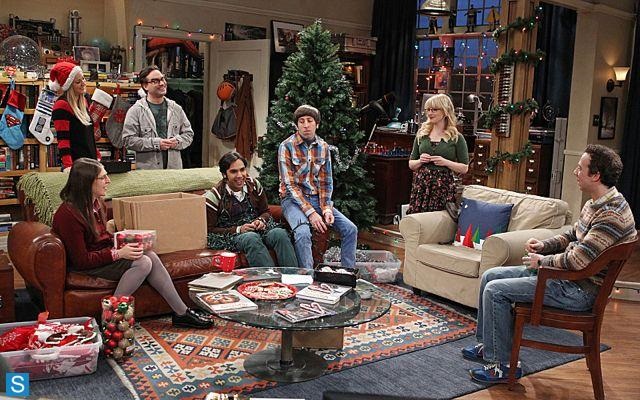 Everybody minus Sheldon are together for a tree decorating Christmas party. Since Sheldon is absent, so are all of his tree decorating rules including the required spacing of the ornaments. Both Star Trek and Star Wars ornaments can now be on the same branches. The fact that Howard is enjoying trimming the Christmas tree might cause his mother to have a heart attack. Bernadette then takes the opportunity to photograph Howard trimming the tree. Penny is a little short of funds this year so her Christmas present is going to be giving him herself, which is what Leonard got last year and last night. Stuart then joins them as Amy’s computer notifies her of an incoming video chat from Sheldon. He thinks that they are so thoughtful that they have a Christmas party after he left since he isn’t into Christmas. His sister has been in labour for an hour and is having a home birth. Raj points out that many women want to give birth at home in a warm comfortable environment. Sheldon feels that she will also turn her bedroom into an amniotic Slip and Slide. Sheldon then gets called away to have a family picture taken because his sister is fully dilated and there is no blood yet.