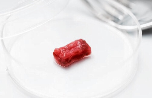 Un frammento della carne sintetica muscolosa come quella bovina ottenuta in laboratorio (fonte: Istituto di scienze industriali, Università di Tokyo)